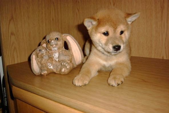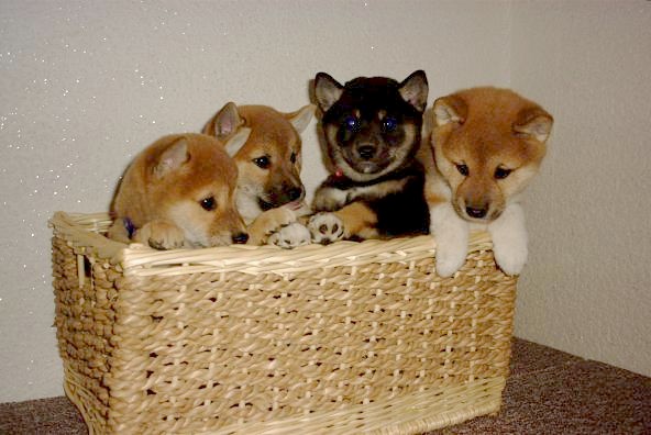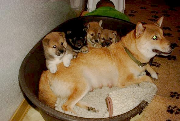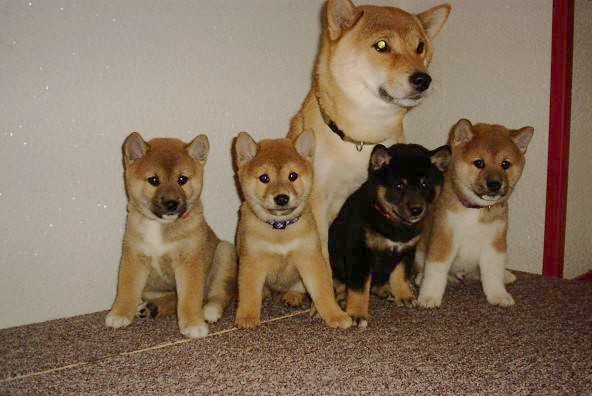 | Hallo ! Wir sind Shiba Inu Hundebabys hier im Bild mit unserer Mama Als das Bild entstand waren wir 4 Wochen alt |