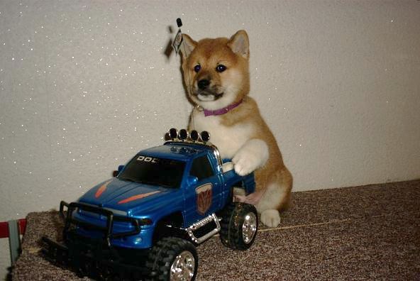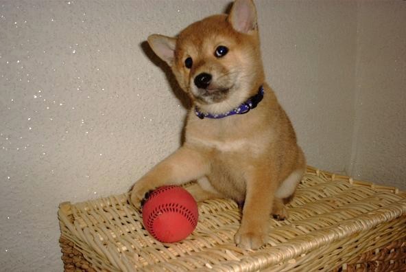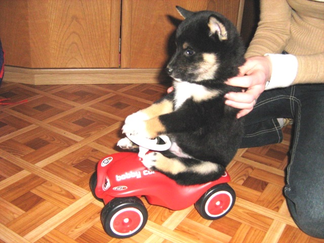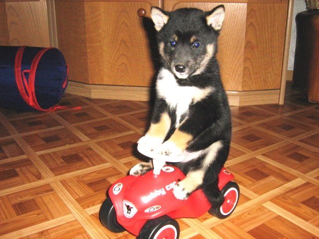 | Ich bin ein kleiner "Schmusebär". Mit mir kann man fast alles machen. So wurde ich auf ein Bobby Car gesetzt und durchs Zimmer geschoben, was ich interessant und sogar schön fand.. Mein Name Enjo ist japanisch und bedeutet "Unterstützer". Naja, ich unterstütze meine Familie, indem ich sie beim Leckerli verbrauchen unterstütze. Wie alle Shibas spiele ich auch furchtbar gerne mit aller Art von Bällen, vor allem Tennisbälle haben es uns angetan. |
