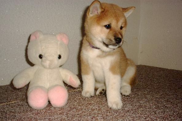 | Ich bin momentan eher etwas zrückhaltend. Deshalb ließ ich erst mal meine Geschwister reden.Da ich etwas scheu bin trägt mich meine Züchterin im Moment überall mit herum. Langsam verliere ich nun meine Scheu Links seht ihr mich mit einem Teddy. Damit ihr nicht lange raten müßt: Ich bin der auf dem Bild rechts. Auf dem rechten Bild spiele ich mit einem Auto. Das ist ja wohl klar, daß ich mit Autos spiele, da ich ein Rüde bin. Meine Schwester Junko - Akiko soll ruhig mit Puppen spielen. Sie ist ja auch ein Mädchen. Ab und zu besucht mich meine neue Familie, bis ich dann ganz zu ihnen ziehen werde. So sind wir schon ziemlich vertraut miteinander. |