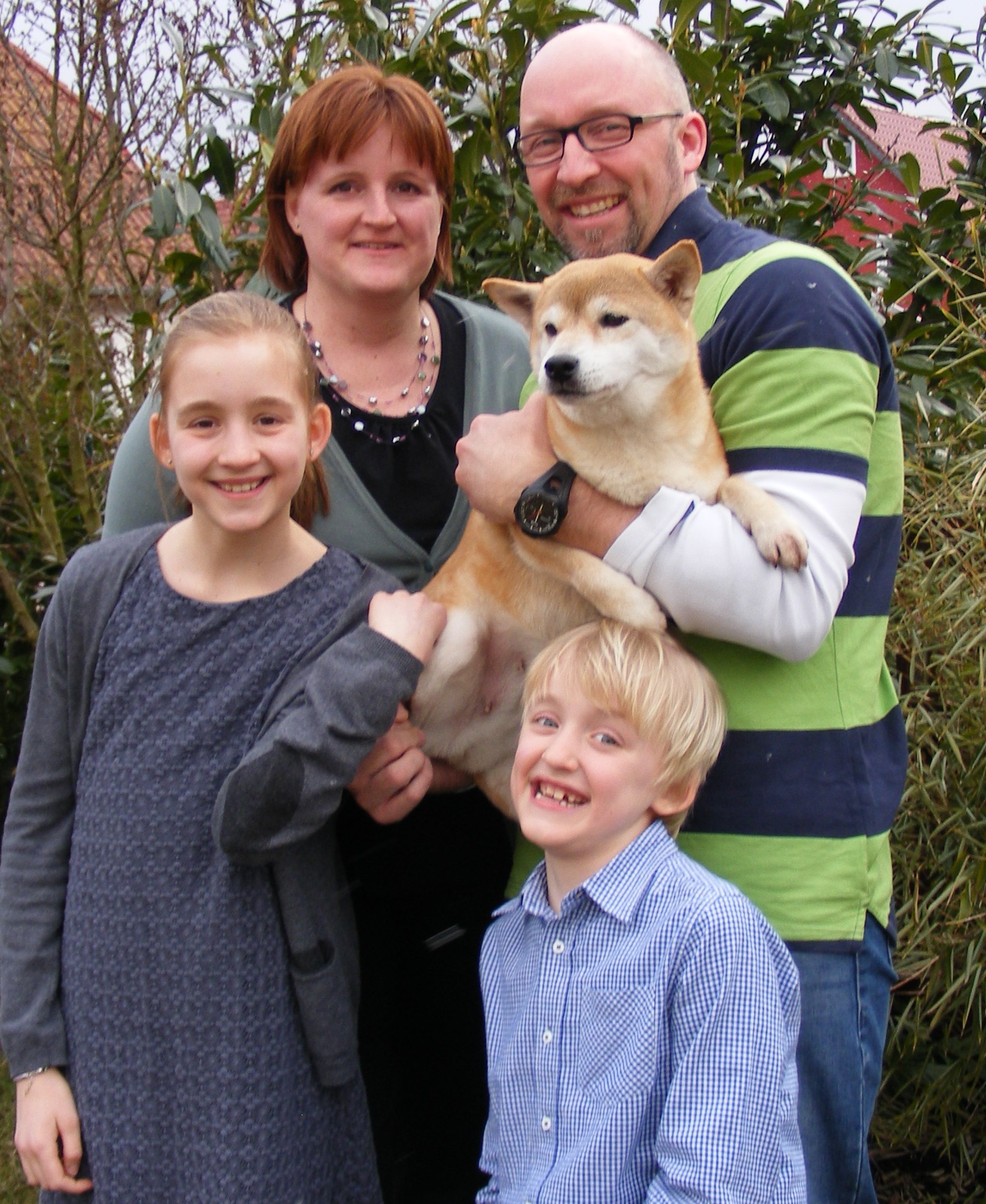 | Ich bin ein treuer Shiba und hier mit meiner Familie. Hinten bin ich mit meinem Vater und meiner Mutter und vorne stehen meine menschlichen Geschwister. |