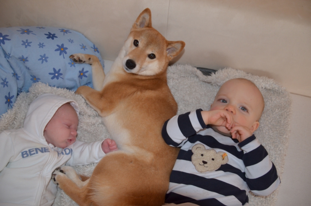 Ich bin ein wachsamer Shiba und bewache hier die beiden Kinder meiner Familie. Bin ich nicht ein tierisch gutes Kindermädchen ? |