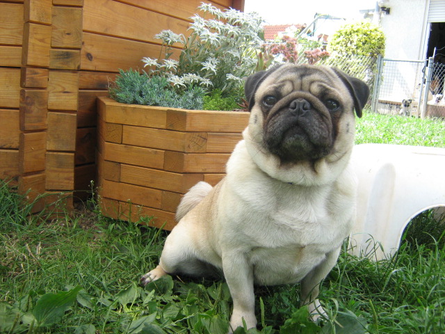 | Ich bin ein lustiger Mops und mache auf der Menschen Knie gern hops. |
